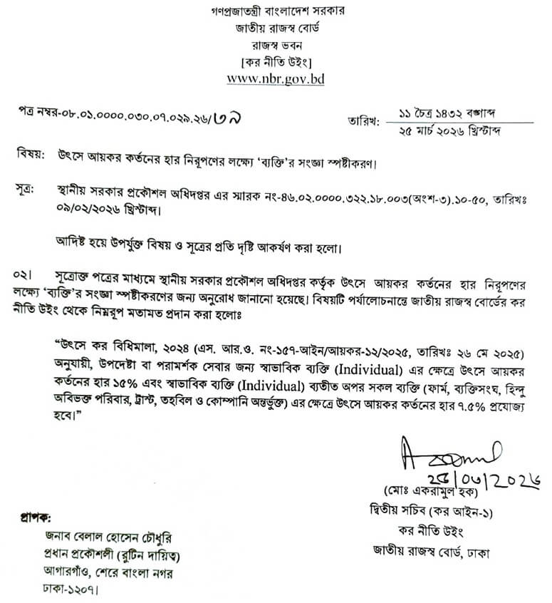 উৎসে কর (IT) সংক্রান্ত বিভিন্ন প্রজ্ঞাপন/স্পষ্টীকরণ/পরিপত্র