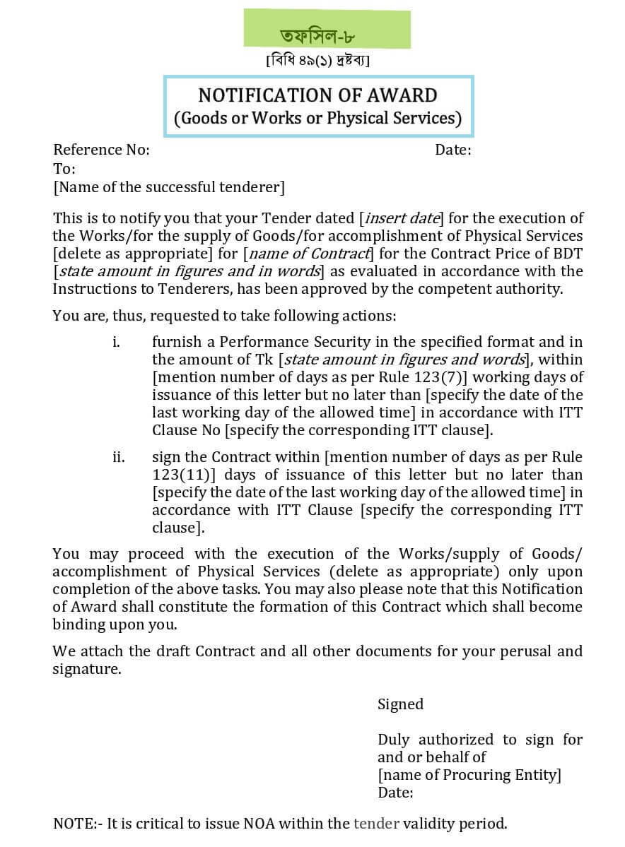 তফসিল-৮ঃ NOTIFICATION OF AWARD (PPR-25)