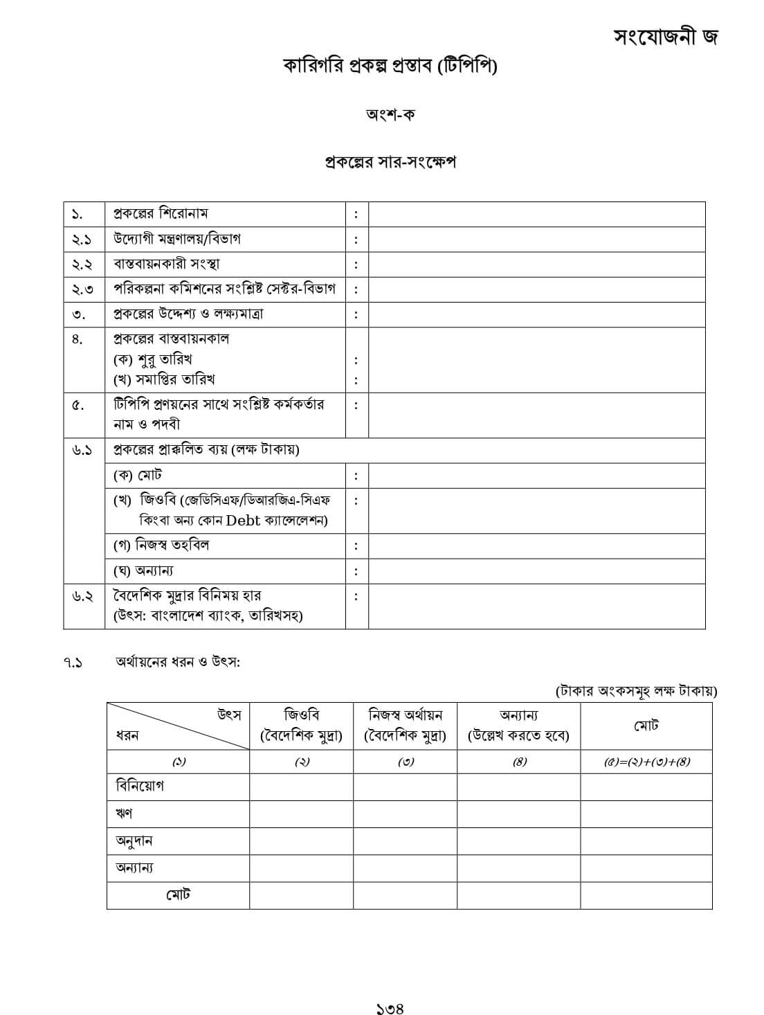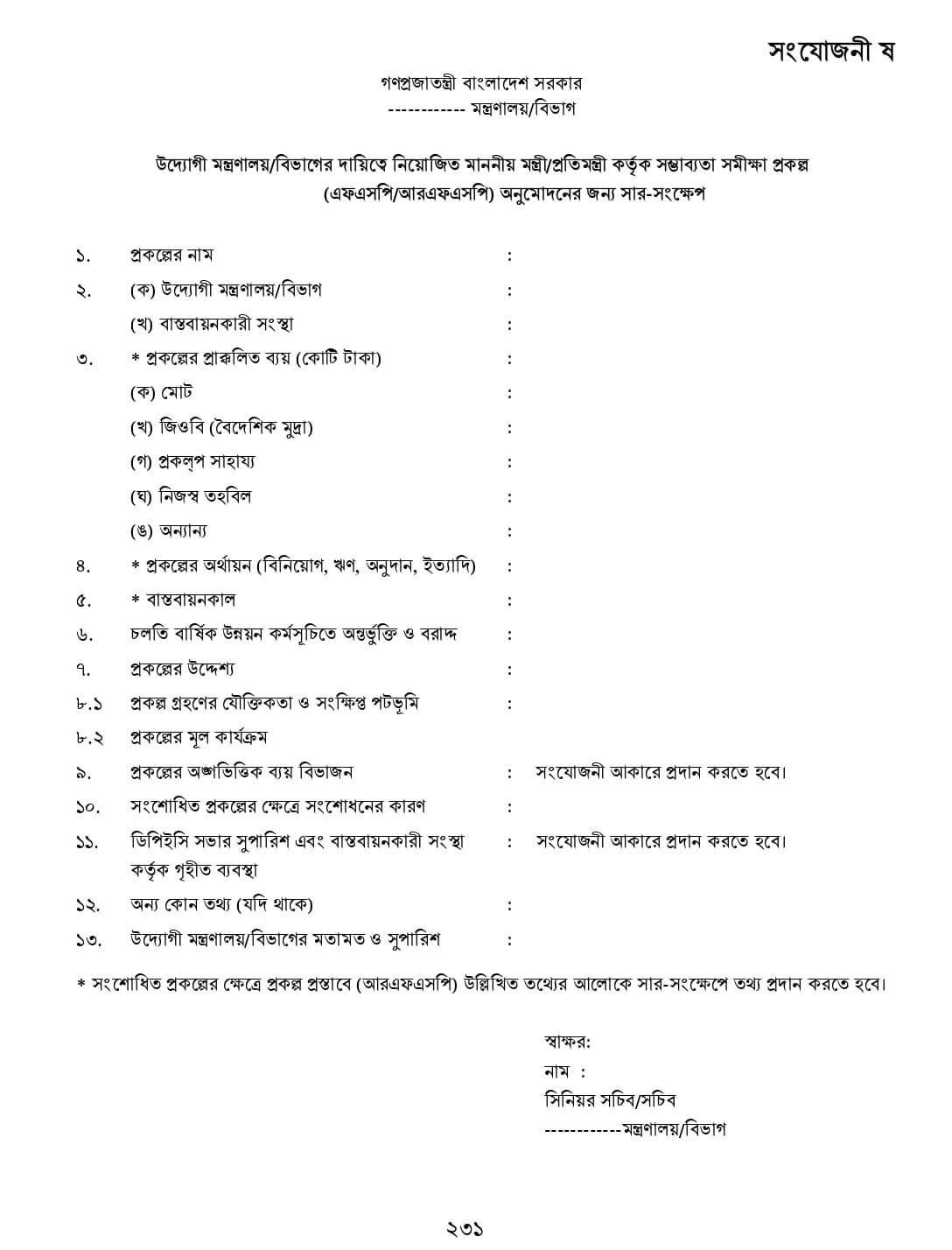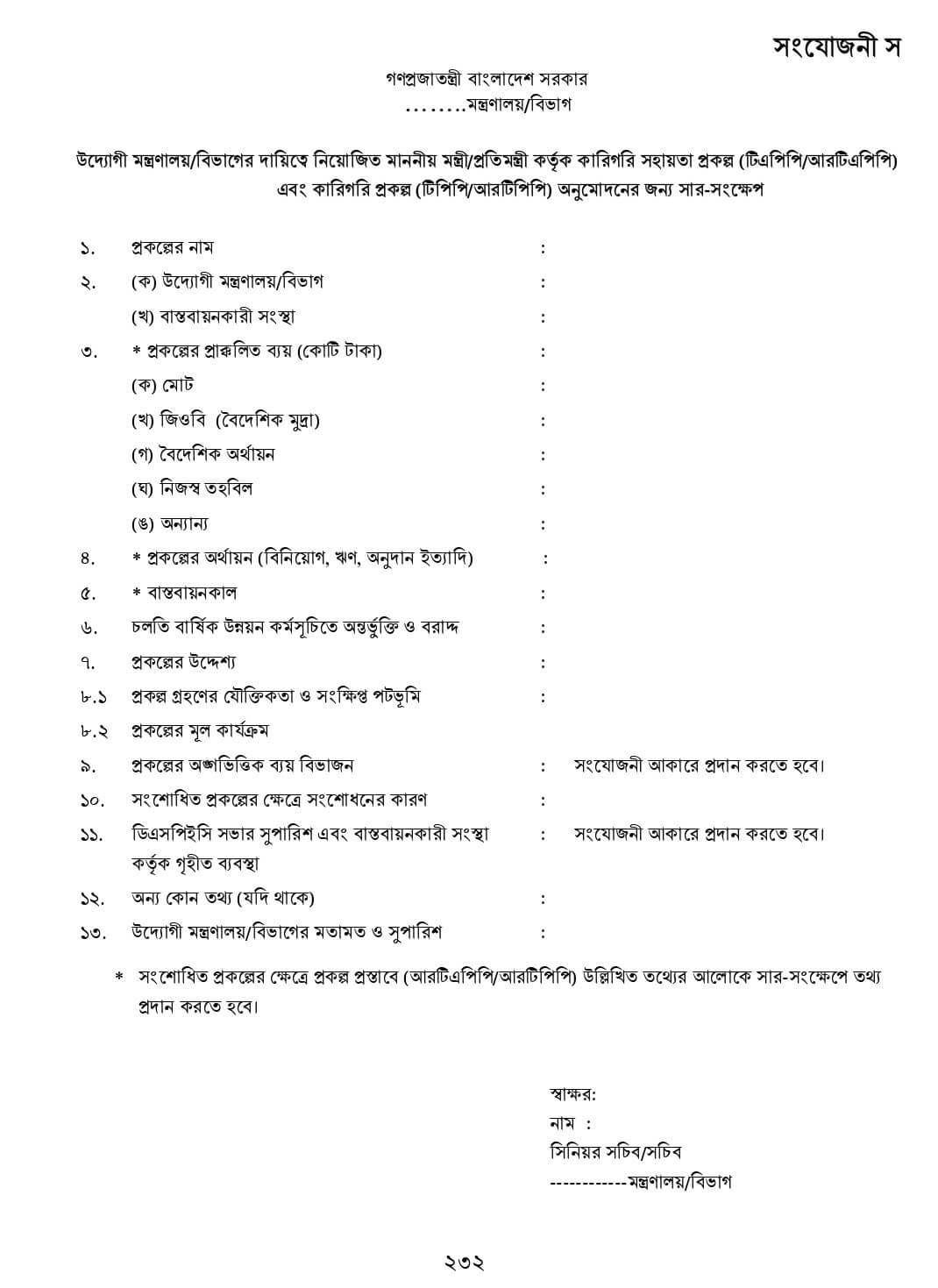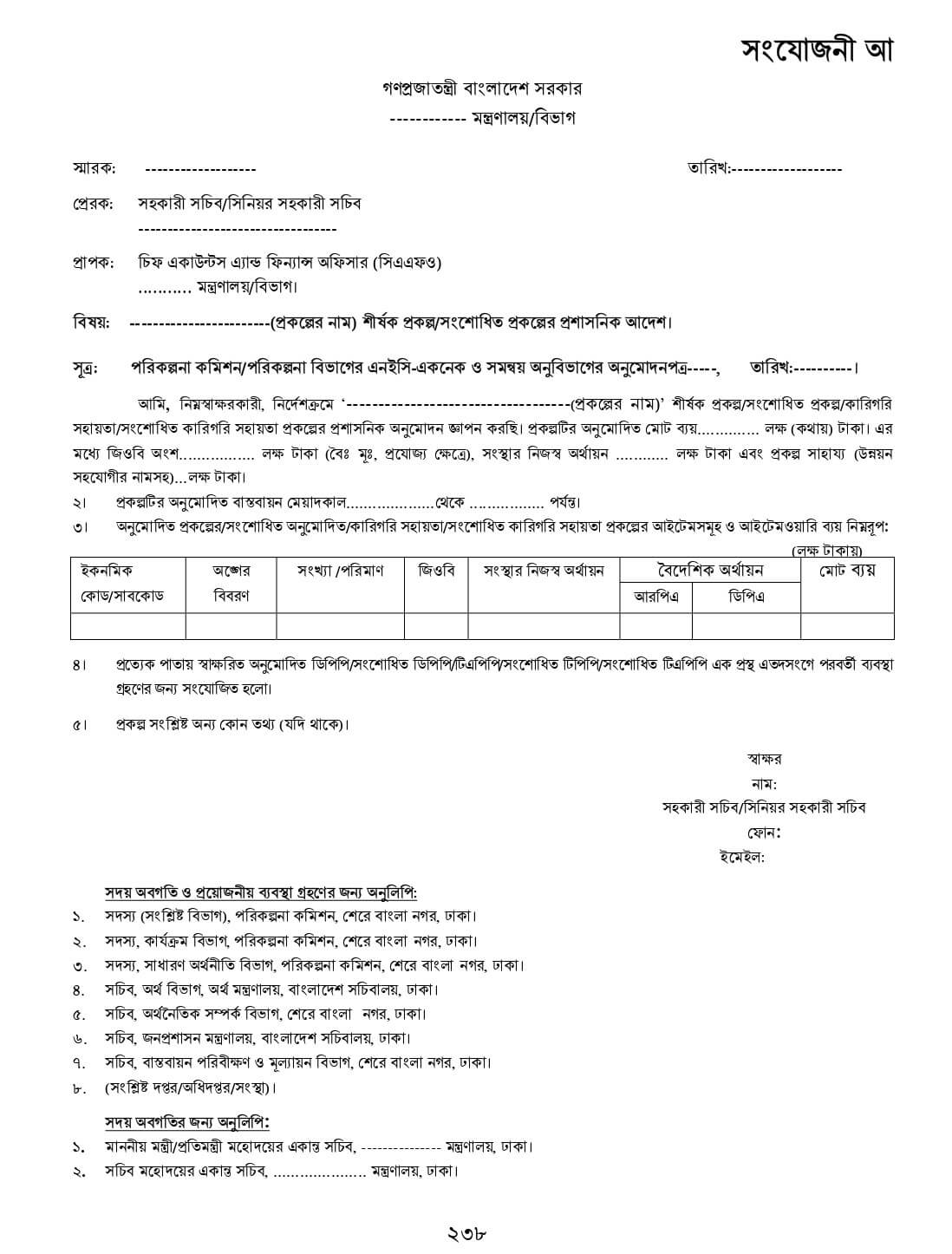 সংযোজনীঃ সার-সংক্ষেপ, কার্যপত্র, প্রকল্পের অনুমোদন পত্র, প্রশাসনিক আদেশের নমুনা
