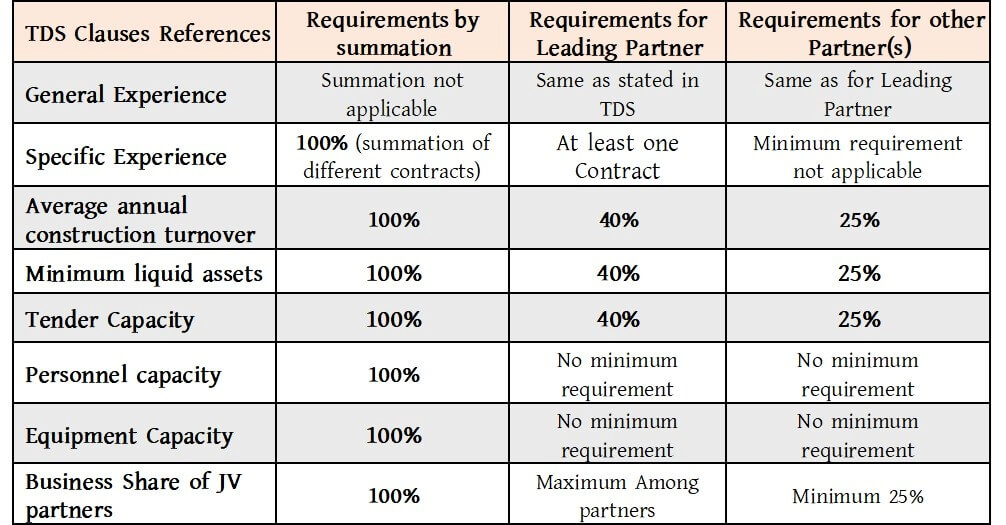 যৌথ উদ্যোগ গঠন করার উদ্দেশ্যই থাকে কোন ক্রয় প্রক্রিয়ায় অংশগহণের জন্য একাধিক ইকোনমিক অপারেটর তাদের সম্পদ, দক্ষতা, প্রযুক্তিগত জ্ঞান, সরঞ্জাম এবং উপকরণ একত্রিত করে ক্রয়কারীর চাহিদা অনুযায়ী যৌথভাবে যোগ্যতা অর্জন করা। সুতরাং বিশেষ কোনো অংশের (Component) জন্য মনোনীত যৌথ উদ্যোগের কোনো অংশীদার উক্ত অংশের জন্য আবশ্যক ন্যূনতম যোগ্যতার শর্ত পূরণে সক্ষম, সেক্ষেত্রে যৌথ উদ্যোগের জন্য আবশ্যকীয় সর্বমোট যোগ্যতা নিরূপণের ক্ষেত্রে উক্ত অংশীদারের অতীত অভিজ্ঞতা এবং অন্যান্য সামর্থ্য অন্যান্য অংশীদারের যোগ্যতার সহিত যোগ করতে হবে। [বিধি-৭০(১২)]