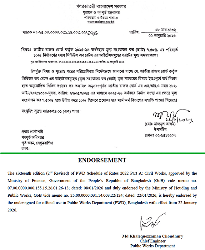 বর্তমানে জাতীয় রাজস্ব বোর্ড (NBR) কর্তৃক নির্মাণ সংস্থার জন্য ১০% মূসক (VAT) নির্ধারণের প্রেক্ষিতে এই দর তফসিল হালনাগাদ করা হয়েছে যা “PWD SCHEDULE OF RATES 2022 (2nd REVISED), PART A: CIVIL WORKS, sixteenth edition (2nd Revised)” নামে অভিহিত হবে।