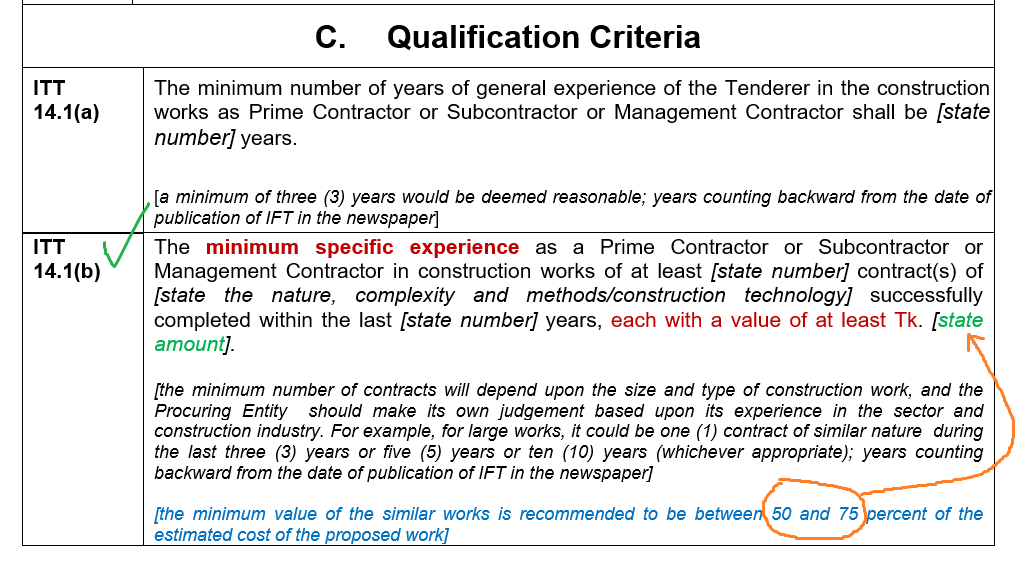 টেন্ডার সিডিউলে দেখা যায় অভিজ্ঞতার সনদ চাওয়া হয়েছে। সেখানে কমপক্ষে কত টাকার অভিজ্ঞতা লাগবে তা উল্লেখ থাকে। টেন্ডারের সময় এস্টিমেটেড (Estimated amount) এর সাথে তুলনা করে অভিজ্ঞতার (Specific Experience) একটা ভ্যালু ঠিক করা হয়। যেমন, দেখা গেলো ৫ কোটি টাকার কাজের জন্য কমপক্ষে ৩ কোটি টাকার কাজের অভিজ্ঞতা চাওয়া হয়েছে।