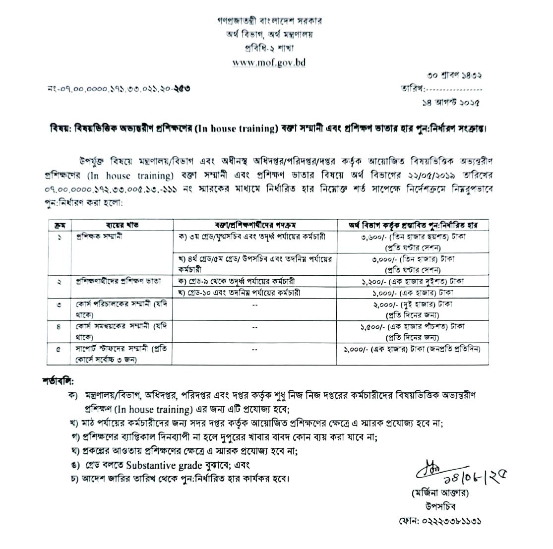 এ হার শুধুমাত্র মন্ত্রণালয়, অধিদপ্তর, দপ্তর, ইত্যাদি অফিসে নিজ কর্মচারীদের অভ্যন্তরীণ প্রশিক্ষণের জন্য প্রযোজ্য হবে।